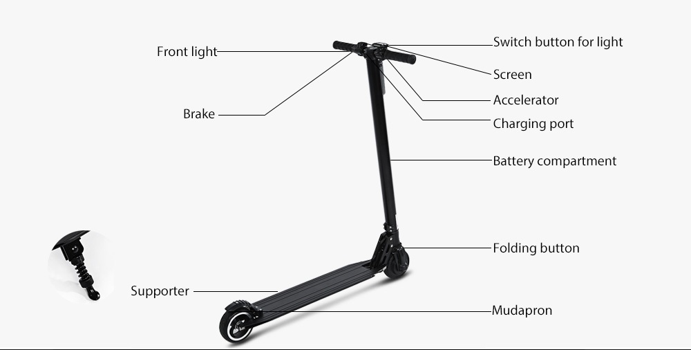 Battery: Lithium-ion battery Mileage (depends on road and driver weight): 8-15km Maximum Mileage: 10km Maximum Speed: 23km/h Max Payload: 120kg Light: Front Lamp Permissible Gradient (depends on your weight): 16-20 degree Battery Capacity: 4400mAh, 52W Motor Rated Power: 250W Charging Time: 3 hours Tire Diameter: 5 inches Working Temperature: - 10 - 40 Deg.C |